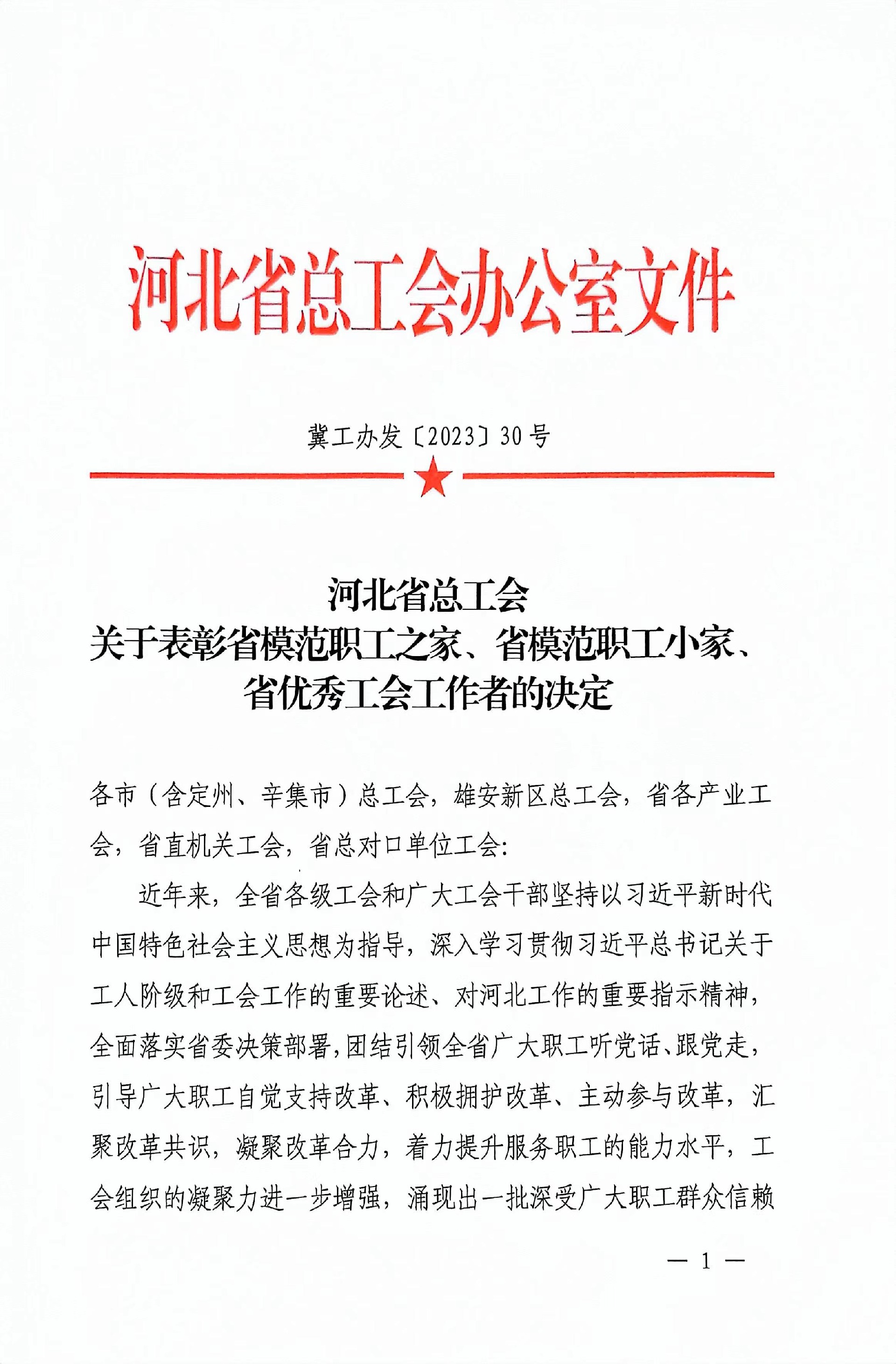 洪海公司榮獲河北省模范職工之家的稱號