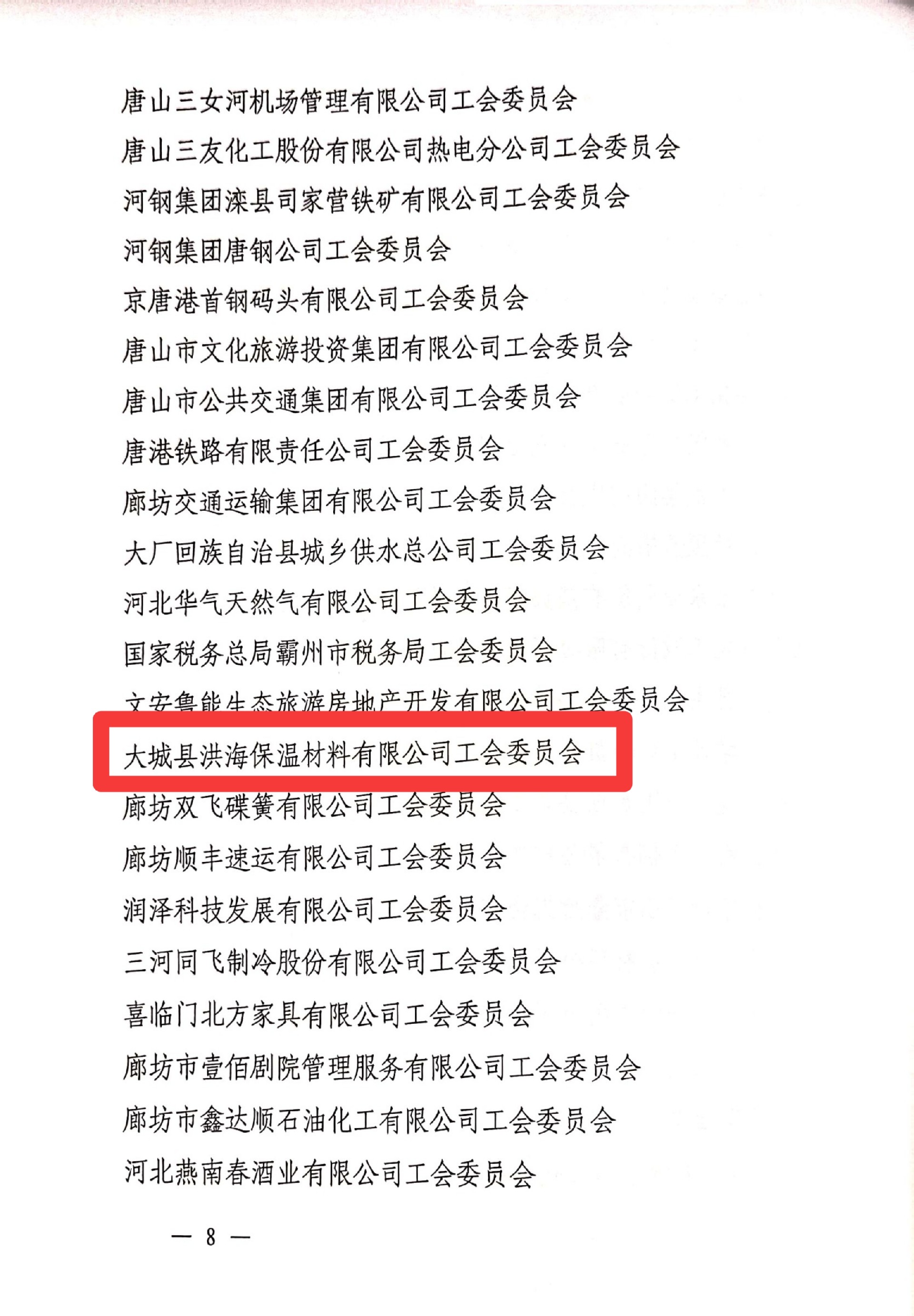 近日,河北省總工會下發(fā)了《關(guān)于表彰省模范職工之家、省模范職工小家、省優(yōu)秀工會工作者的決定》,大城縣洪海保溫材料有限公司被授予“河北省模范職工之家”的稱號。縣人大副主任劉增懷、縣總工會常務(wù)副主席魏博為洪海公司頒發(fā)證書。